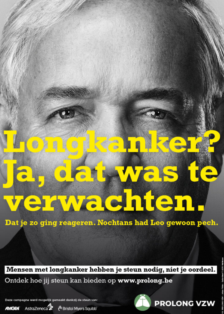 Samen met PROLONG VZW hebben we de bewustmakingscampagne “Mensen met longkanker hebben je steun nodig, niet je oordeel.” gelanceerd? Het doel van de campagne is om de publieke perceptie van longkanker in België aan te pakken.